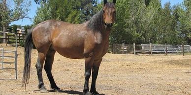 Cowboy- The approximately ten year old bay roan truly wild mustang. He was rounded up by helicopter on the plains of California with his whole family. The family was then separated; the Colts and Stallions were put into chutes and castrated. The rest of his family, were sadly, never again to be seen by this extremely gentle and petrified soul. After six months of being held at the BLM facility, he was “adopted” by a man who wanted to “break” him. He was then loaded up into a big trailer crowded with many other horses and driven to California to be part of a horse whisperer project. In the trailer he was kicked so badly his knee looked as if it were broken, as he could hardly walk on it. The order was to shoot him, as he was unusable. A dear friend of the sanctuary heard of this and drove directly to the ranch and picked him up. He is now part of the small herd at the sanctuary. His knee had healed but his deeply injured soul might never recover. We have made the decision to allow him to remain wild. He is fat, happy and feels at home in his special corral at night and then he is free to roam all day and choose which areas they will pick next to test the grass. Our hopes for him are to get him to a large wild horse sanctuary where we can fulfill our promise to him that someday, he will be wild again. Tammy has been working with him and has gotten him to trust her. She can halter him, lead him and pick up his feet. We are working on “pinching” his neck to prepare him for his Coggins test. We are very excited for him and his future. His monthly costs are $400.00.