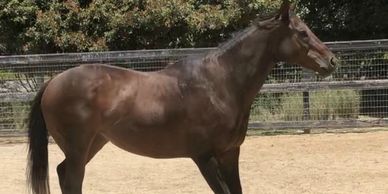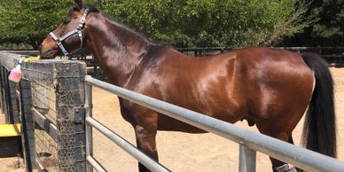 Jordan is a 11-year-old brown Thoroughbred gelding. He had raced in California, and owned by a movie star. We have no idea what happened to him after that time but last year, we pulled him out of a terrible situation where he had been starved and was also knee-deep in mud for a very long time. Jordan has special shoes and is on an anti-inflammatory medication to manage the pain in his legs.